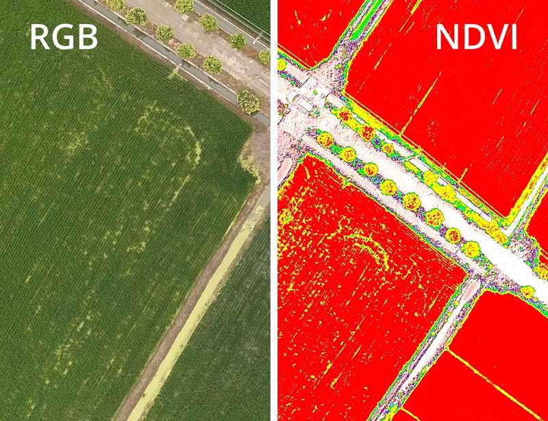 通过精灵4 多光谱版采集到的多光谱影像信息,连同后续分析出的NDRE2 、NDVI 等植被数据,可让农户和农技人员及时作出应对策略,从而降低运营成本、提高产量。航拍无人机
